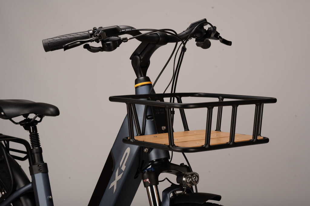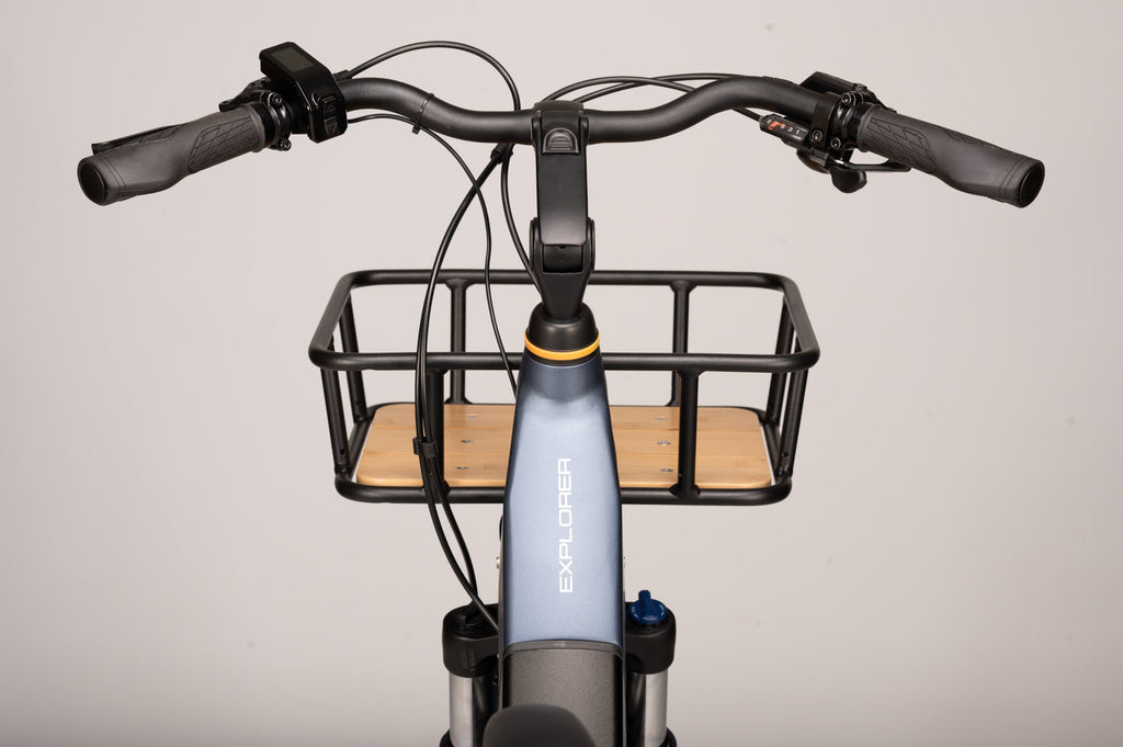 L’utilissimo portapacchi anteriore è ancorato direttamente al telaio e non sulla ruota come di solito su altre bici.